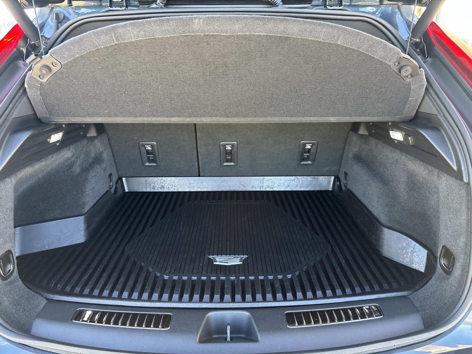 - Opens or closes when the system senses the key fob and the driver extends their foot under the left-hand side of the rear bumper over an image of the Cadillac Crest projected under the vehicle